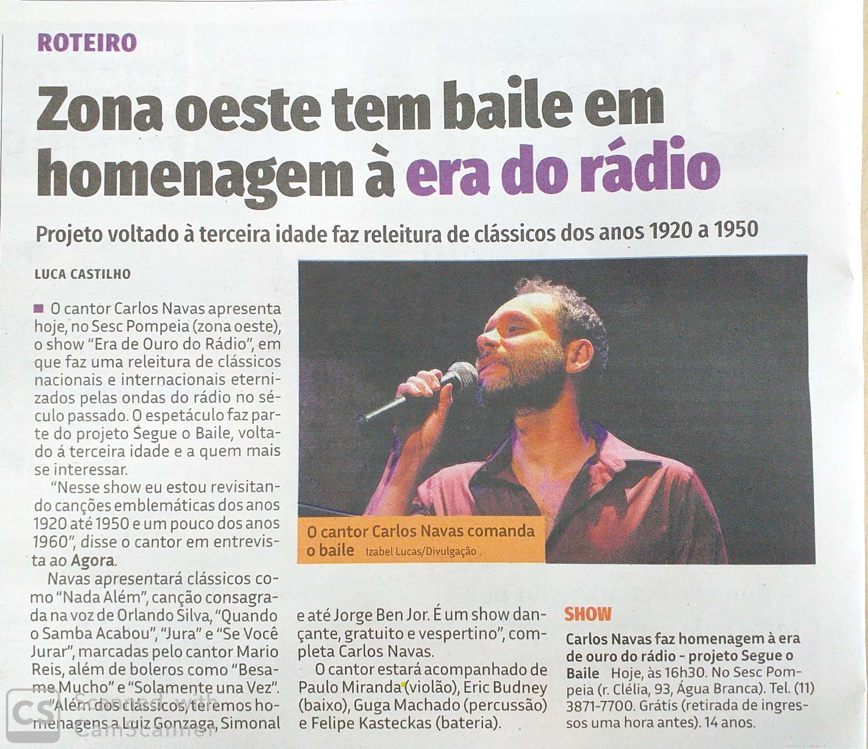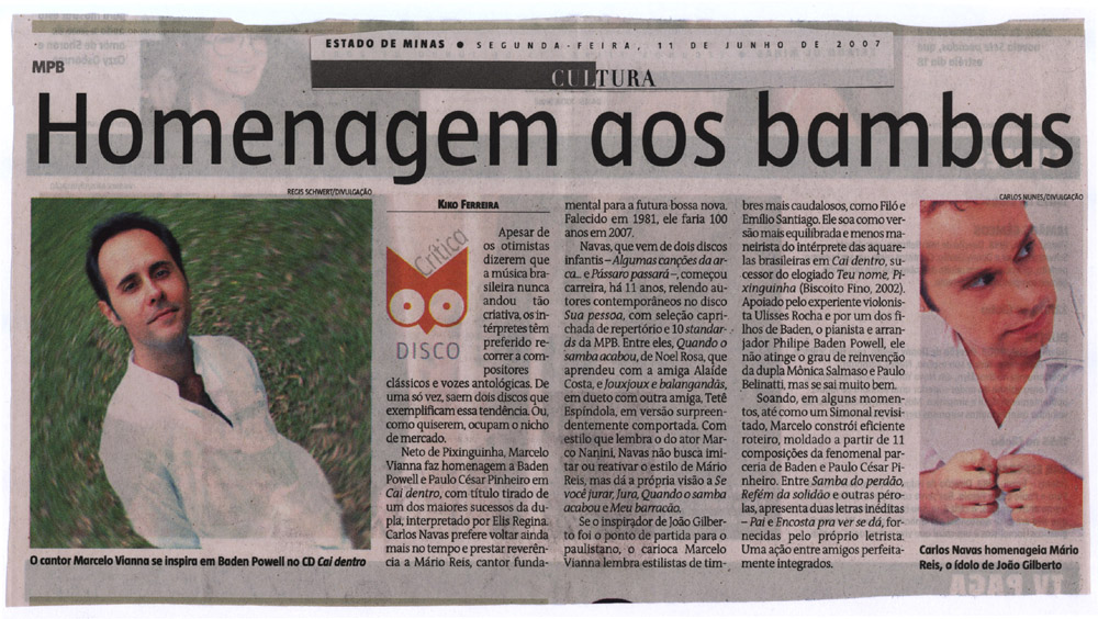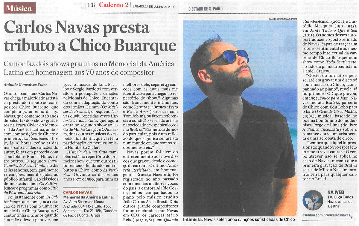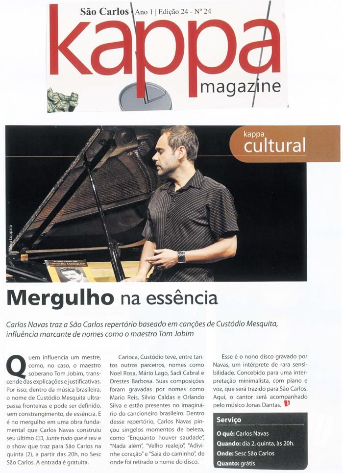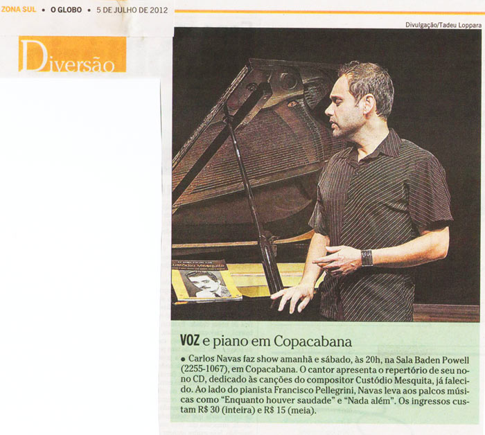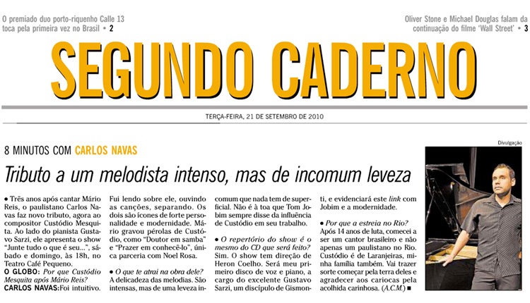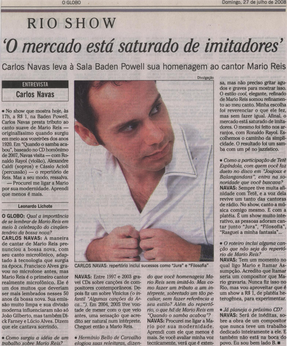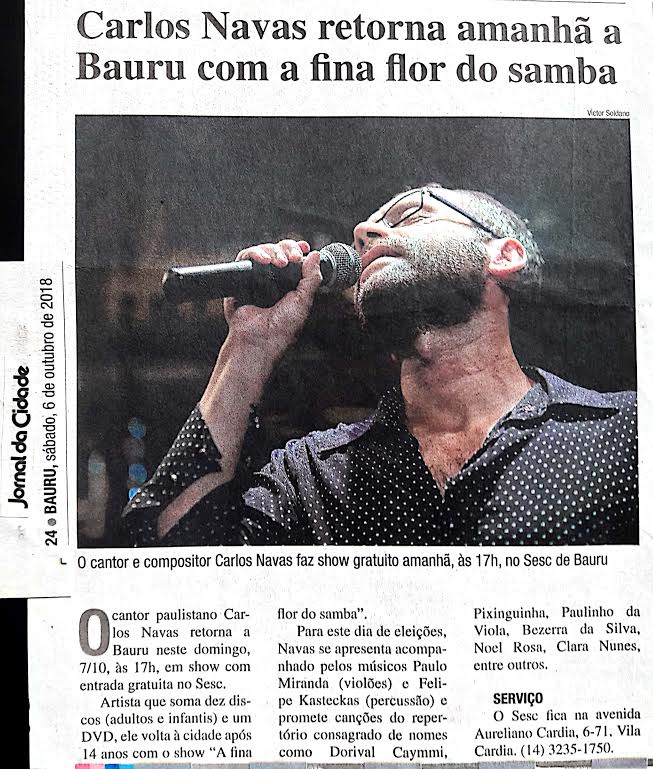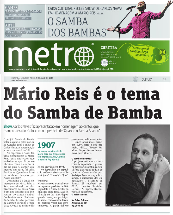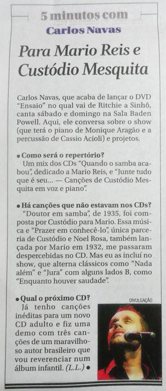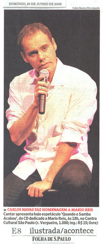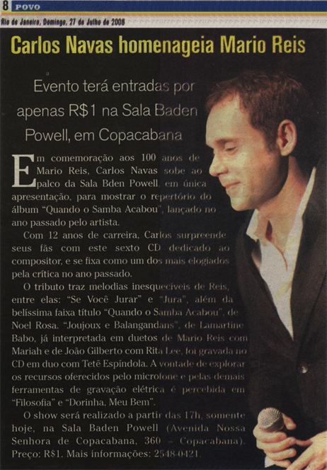 Alguns autores célebres do nosso cancioneiro são aqui reverenciados pelo cantor Carlos Navas, um dos expoentes da nova música brasileira, cuja carreira soma mais de 20 anos e acumula 10 discos (adultos e infantis) e 1 DVD lançados e elogiados. Neste espetáculo elegante e interativo, sua voz passeia pelas obras de Wilson Moreira, Ney Lopes, Ismael Silva, Noel Rosa, Dorival Caymmi, Sinhô, Pixinguinha, Dona Ivone Lara, Paulinho da Viola, Baden Powell, Tom Jobim e Vinicius de Moraes, além de homenagens a Bezerra da Silva e Clara Nunes. Vale a pena lembrar que Navas lançou em 2007 o CD “Quando o Samba Acabou” – Dedicado a Mario Reis, considerado um dos melhores do ano pela crítica, e que trazia alguns clássicos eternizados pelo homenageado.