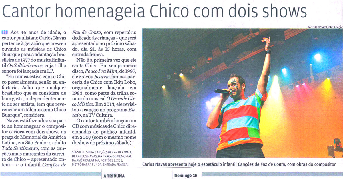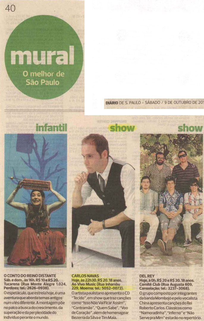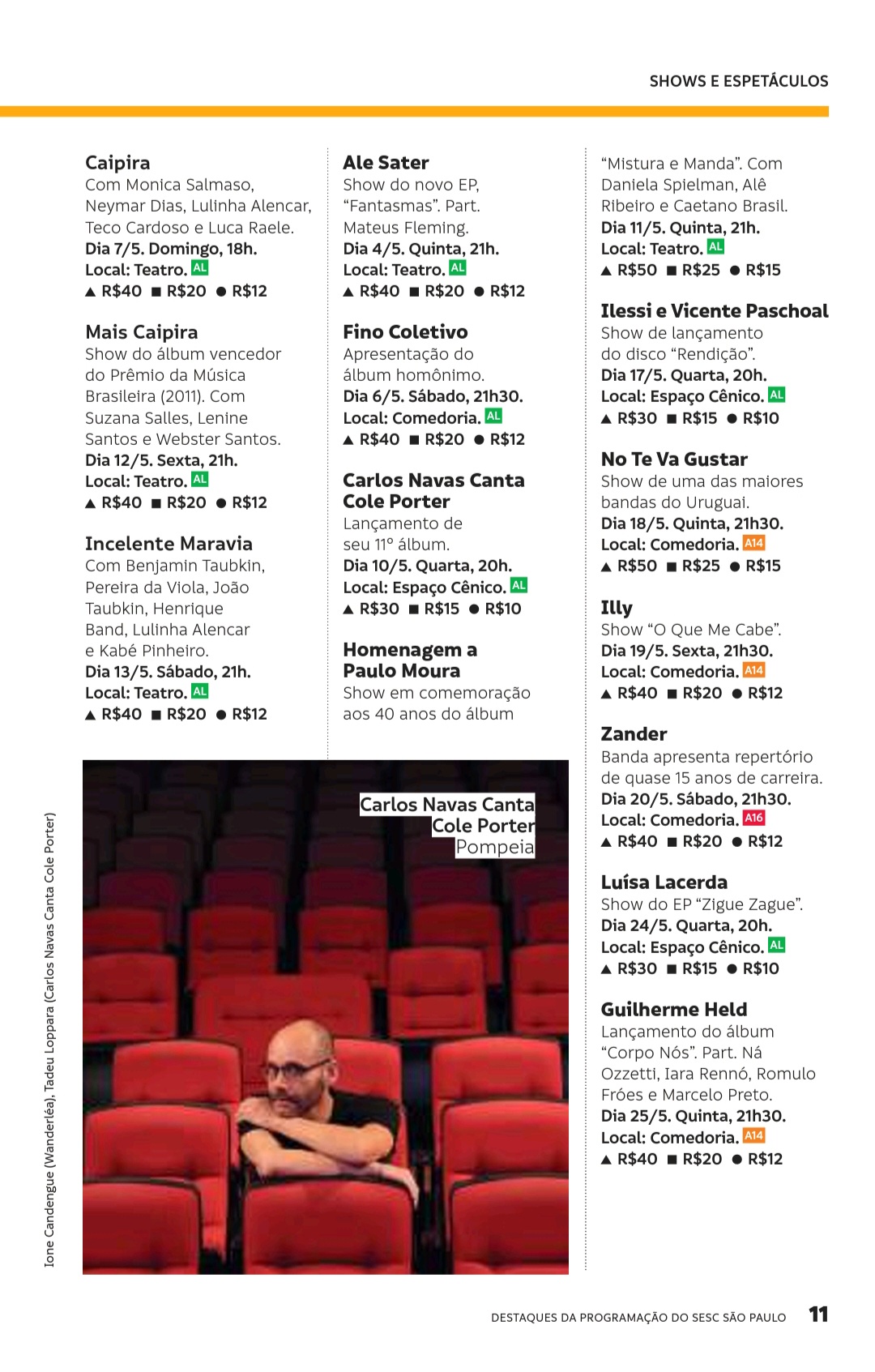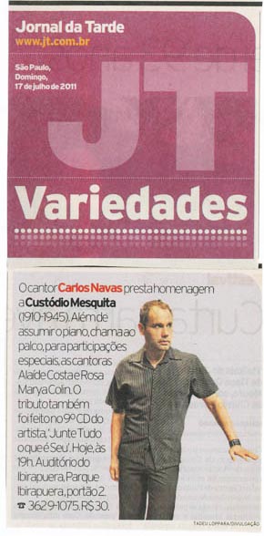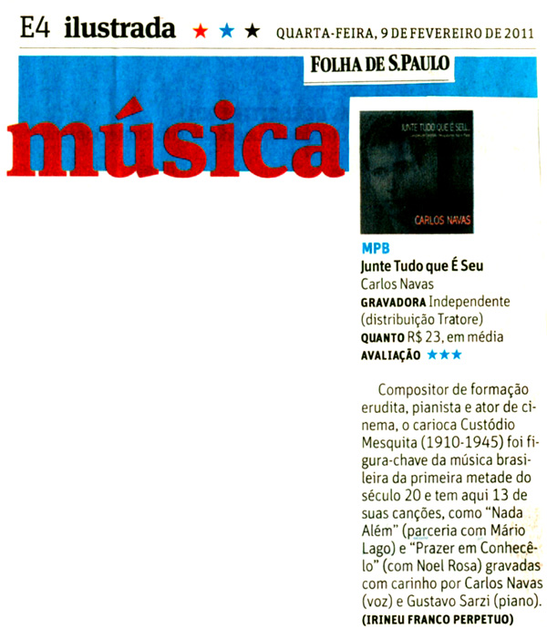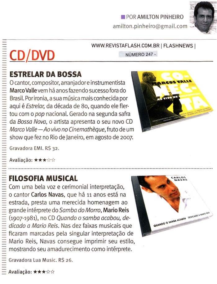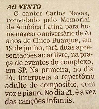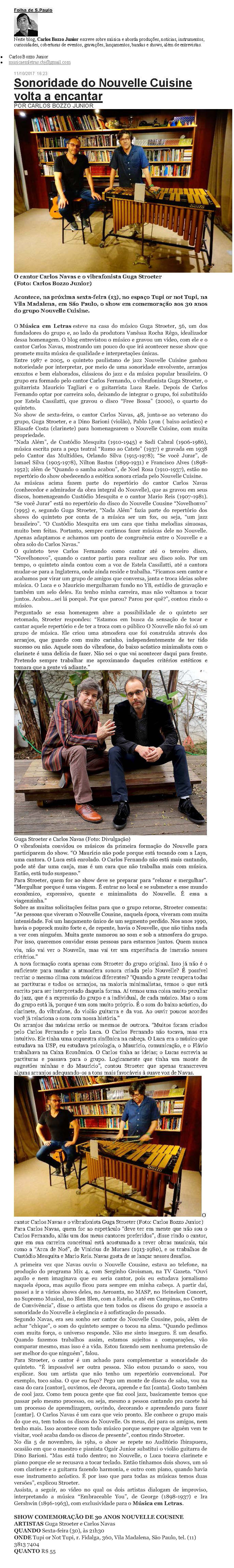 Alguns autores célebres do nosso cancioneiro são aqui reverenciados pelo cantor Carlos Navas, um dos expoentes da nova música brasileira, cuja carreira soma mais de 20 anos e acumula 10 discos (adultos e infantis) e 1 DVD lançados e elogiados. Neste espetáculo elegante e interativo, sua voz passeia pelas obras de Wilson Moreira, Ney Lopes, Ismael Silva, Noel Rosa, Dorival Caymmi, Sinhô, Pixinguinha, Dona Ivone Lara, Paulinho da Viola, Baden Powell, Tom Jobim e Vinicius de Moraes, além de homenagens a Bezerra da Silva e Clara Nunes. Vale a pena lembrar que Navas lançou em 2007 o CD “Quando o Samba Acabou” – Dedicado a Mario Reis, considerado um dos melhores do ano pela crítica, e que trazia alguns clássicos eternizados pelo homenageado.