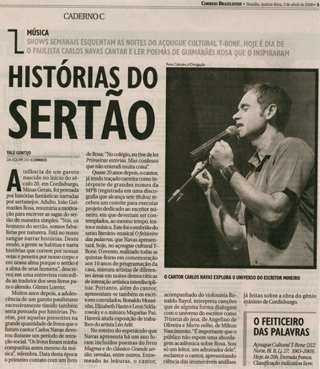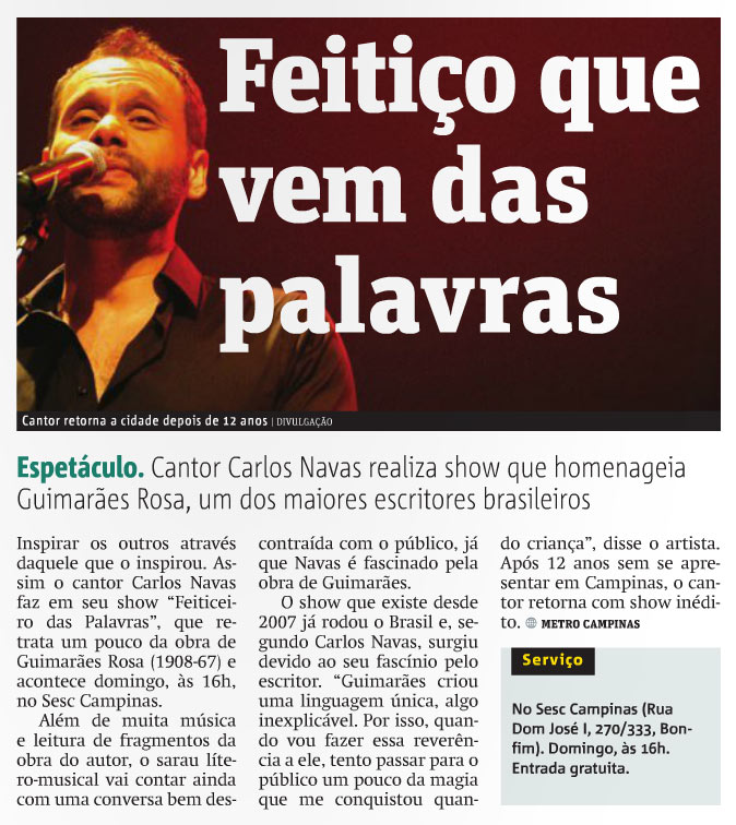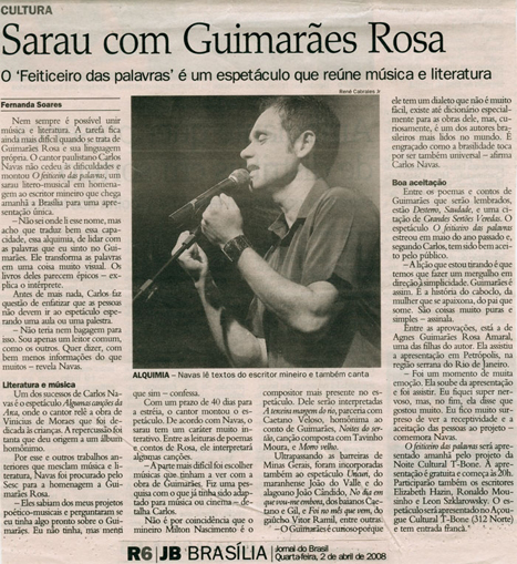 "Neste Sarau lítero musical, uma conversa com o público, Carlos também é um leitor interessado e fascinado pela obra de João Guimarães Rosa, repartindo com os ouvintes as surpresas e a magia do autor. É a palavra escrita sendo lida por alguém que tem na voz o seu instrumento de comunicação e encantamento. A leitura de trechos da obra do autor será entremeada por belíssimas canções brasileiras, como “Tristeza do Jeca” (Angelino Moreira), “Uricuri” (João do Valle/José Cândido), “Morro Velho” (Milton Nascimento), “A Terceira Margem do Rio”, parceria de Milton Nascimento e Caetano Veloso, inspirada no conto de mesmo nome e tema do filme de Nelson Pereira dos Santos (94), e “Noites do Sertão” (Milton e Tavinho Moura), também título do longa de Carlos Alberto Prates Corrêa (84), adaptação de contos do livro Buriti. A belíssima “Sagarana”, de João de Aquino letrada por Paulo César Pinheiro, e gravada magistralmente por Clara Nunes, também está no roteiro, já que foi uma homenagem dos compositores ao livro homônimo. Simplicidade é a tônica deste projeto, lição maior que Carlos aprendeu como cúmplice atento de Guimarães Rosa. O espetáculo já circulou pelo interior fluminense no Festival de Inverno do SESC Rio 2007, passou por Brasília, Rio e São Paulo (capital e interior) e foi a principal atração da XX Semana Roseana, em julho de 2008, em Cordisburgo (MG), Cidade Natal do autor, quando reuniu 2 mil espectadores em praça pública.