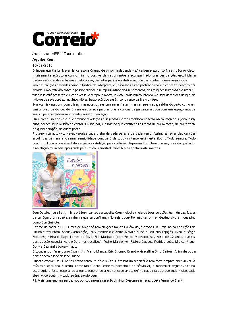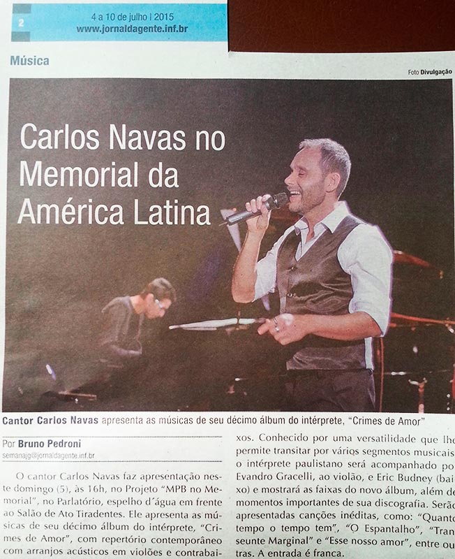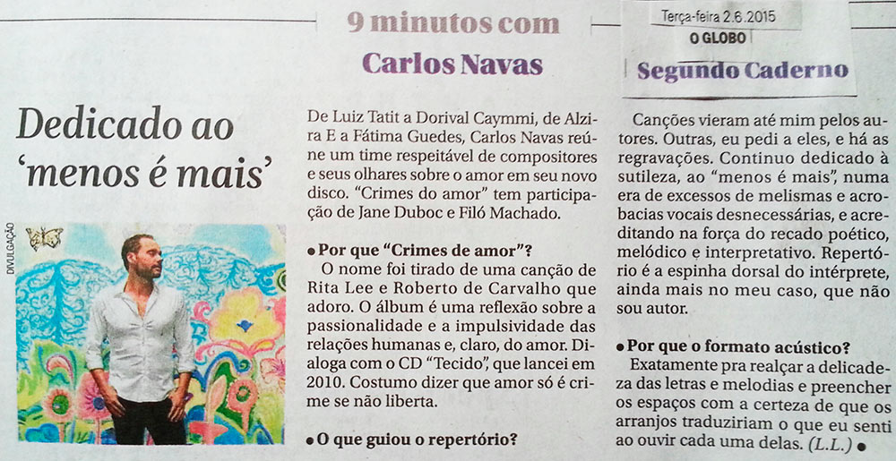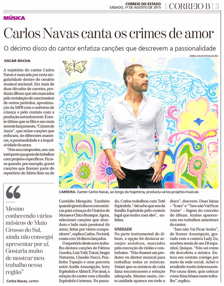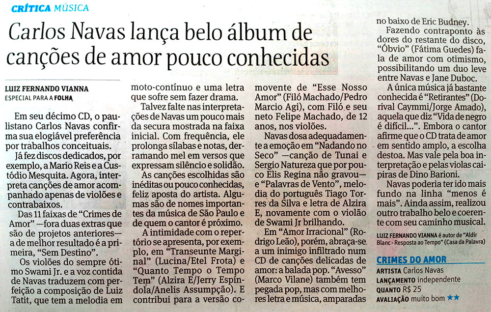 Conhecido por uma versatilidade que lhe permite transitar por vários segmentos musicais, o intérprete paulistano Carlos Navas está lançando uma nova tiragem de seu décimo álbum, “Crimes de Amor”, extremamente bem recebido pela crítica, onde apresenta um repertório contemporâneo em arranjos completamente acústicos, calcados em sonoridades e timbres de violões e contrabaixos. Uma reflexão pessoal do artista sobre a passionalidade e a impulsividade dos sentimentos, das relações humanas e, claro, sobre o amor. São canções inéditas, como: “Quanto tempo o tempo tem” (Anelis Assumpção/ Jerry Espíndola/Alzira E), “O Espantalho” (Claudio Nucci/Paulinho Tapajós), “Transeunte Marginal” (Lucina/Etel Frota) e “Esse nosso amor” (Filó Machado/Pedro Marcio Agi), esta com a participação de Filó ao violão, arranjo e vocalises e de seu neto, Felipe Machado, de apenas 12 anos, no segundo violão. Outras são “quase inéditas”, pois já foram gravadas anteriormente, caso de “Sem Destino” (Luiz Tatit), “Palavras de Vento” (Alzira E / Tiago Torres da Silva), “Avesso” (Marco Vilane), “Amor Irracional” (Rodrigo Leão), “Nadando no Seco“ (Tunai/Sergio Natureza) e “Óbvio” (Fátima Guedes), em dueto com Jane Duboc. Uma releitura de “Retirantes” (Dorival Caymmi/Jorge Amado), tema da novela “Escrava Isaura” nos anos 1970, foi gravada com violas caipiras em arranjo e execução de Dino Barioni, um dos instrumentistas convidados, ao lado de Swami Jr, Mario Manga, Evandro Gracelli e Eric Budney. Fazem parte do álbum duas bônus tracks que diferem do conceito sonoro do álbum. “Ícaro” (Fred Martins/ Marcelo Diniz) fez parte do terceiro cd do artista, “Tanto Silêncio” (Movieplay/2003), atualmente fora de catálogo. O áudio aqui incluído foi extraído do DVD “Ensaio” (2013), que registrou a passagem do artista pelo programa televisivo homônimo, criado e dirigido por Fernando Faro. “Isso não vai ficar Assim” (Itamar Assumpção) tinha sido gravada no cd “Tecido” (Lua Music/2010), seu oitavo álbum, em dueto com a diva disco Lady Zu. A novidade é que a canção ressurge num remix criado pelo DJ espanhol Quique, que vem embalando as pistas européias. Concebido e produzido pelo próprio Carlos, “Crimes de Amor” é um lançamento independente, distribuído pela Tratore, que também pode ser adquirido diretamente pelo site oficial do artista: www.carlosnavas.com.br.