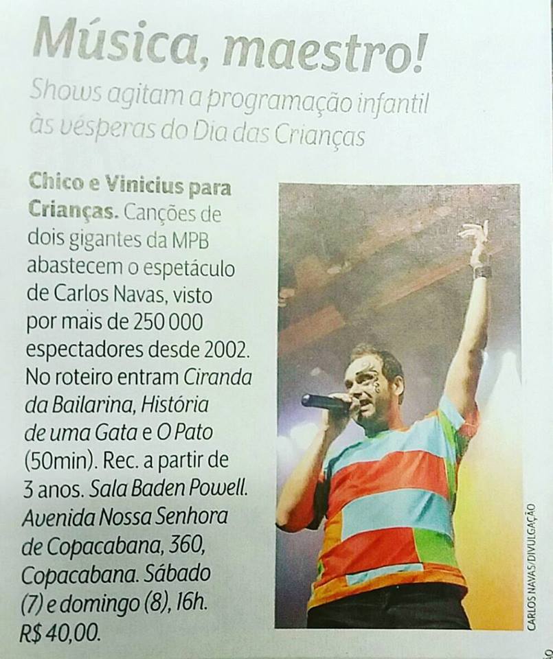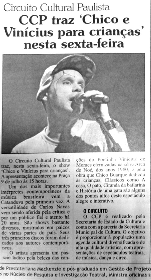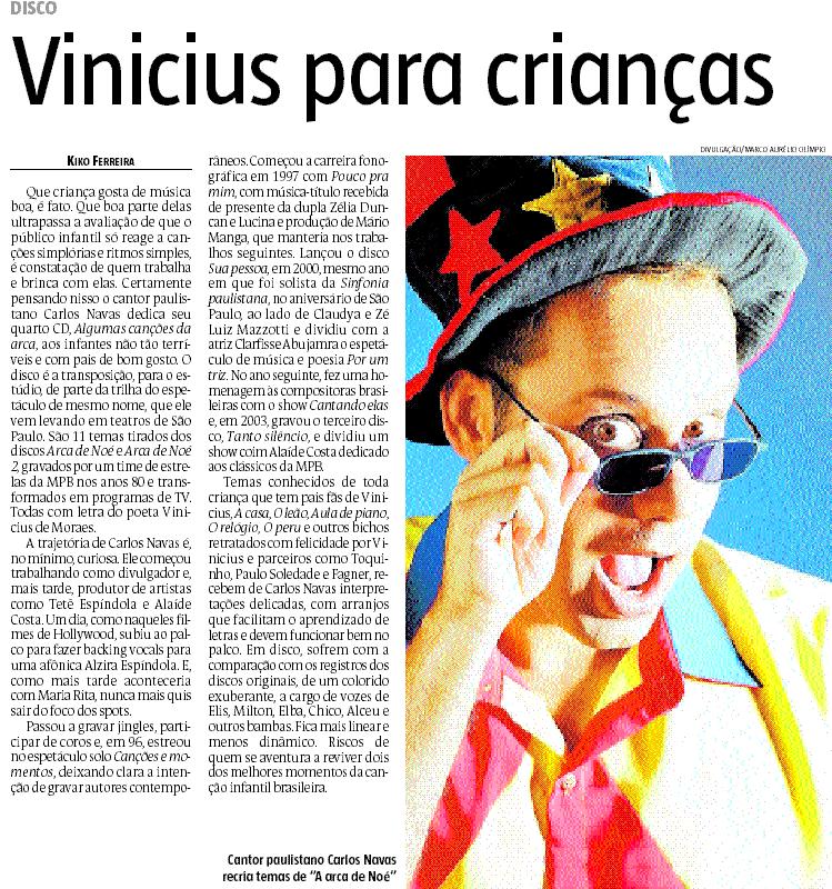 Sua primeira experiência musical com o universo infantil foi o álbum “Algumas Canções da Arca...” (Movieplay/ 2004), fruto do espetáculo onde relê parte da obra que Vinicius de Moraes dedicou aos pequenos na série “Arca de Noé”, dos anos 80. Este show soma mais de 250 mil espectadores desde a sua estréia e levou o trabalho do artista a um público que não o conhecia: as crianças. O espetáculo ocupou os mais diversos espaços, como Praças, Clubes, Teatros, Unidades do Sesc, CEU’s, Shopping Centers e etc, e a reação da platéia foi incrivelmente positiva. Com este resultado e a receptividade da crítica especializada, surgiu a idéia de um novo disco com esta temática, que também vinha sendo pedido pelo público. Pesquisando algo com a mesma qualidade atemporal da “Arca”, Carlos teve a idéia de trabalhar com a obra de Chico Buarque. De imediato, vieram à sua mente músicas do espetáculo teatral “Os Saltimbancos” (1977), que ele assistiu na infância :”História de Uma Gata”, “O Jumento”, e do filme “Os Saltimbancos Trapalhões” (1981), “Rebichada e “Hollywood”. Mas “Canções de Faz de Conta” (Lua Music/2007), seu sétimo disco, vai além, incluindo músicas que, em novos arranjos e, principalmente, com a leitura do artista, têm enfatizado seu aspecto lúdico (marca maior do show e CD “Algumas Canções da Arca...”), como “Ciranda da Bailarina” (de “O Grande Circo Místico”) e “A Banda. No show CHICO E VINICIUS PARA CRIANÇAS, bastante alegre e interativo, Carlos Navas também relembra momentos de “Algumas Canções da Arca...”, como “A Casa”, “O Pato” e “A Pulga, “As Abelhas”, “O Relógio” e “O Pinguim”. Com ele, um duo de violão e percussão.