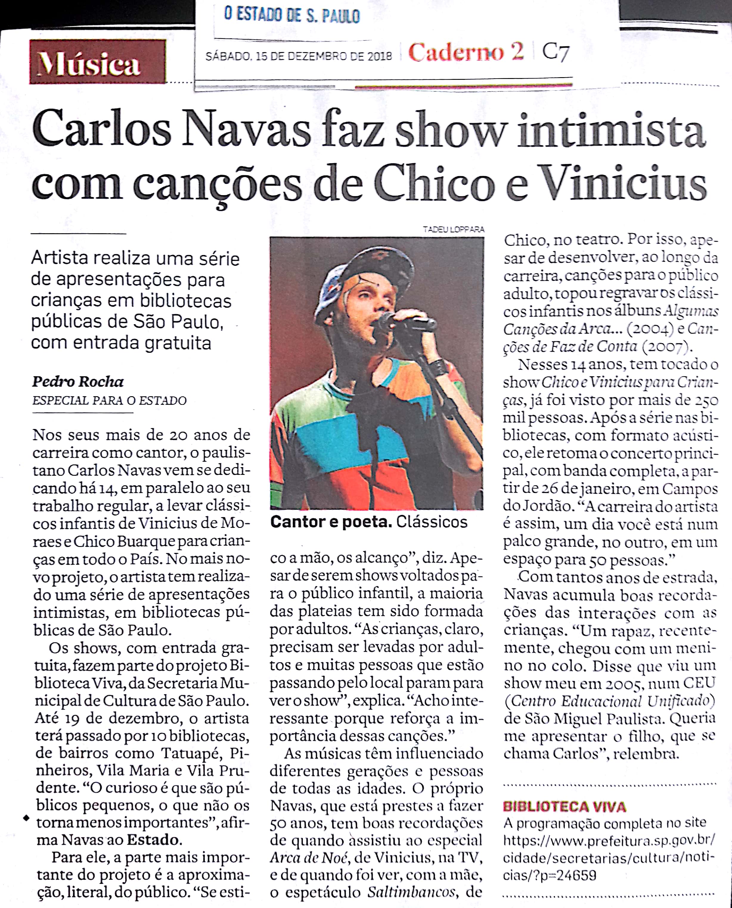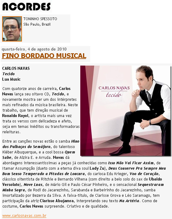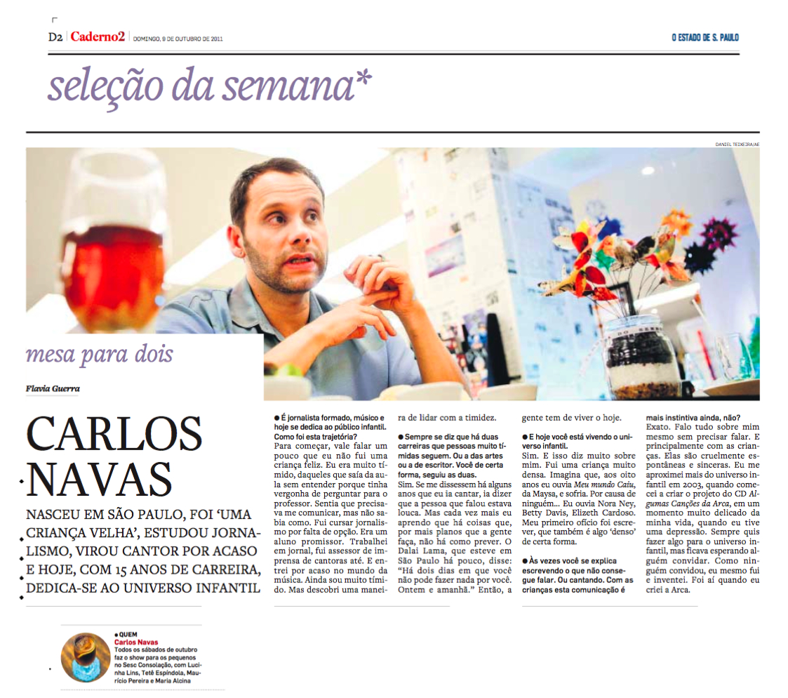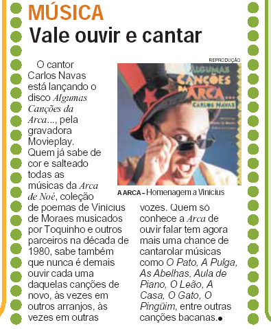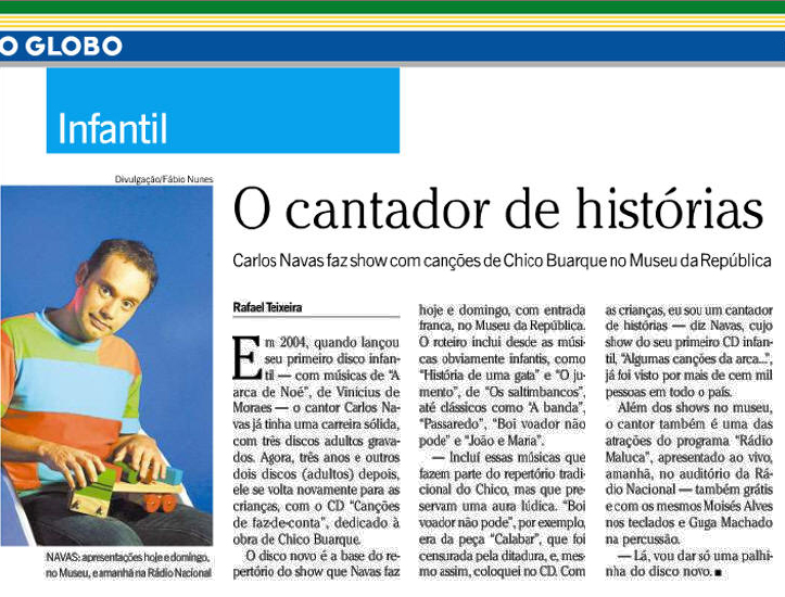 Carlos Navas é um dos mais expressivos cantores da nova música brasileira. Com 20 anos de carreira, 10 cd´s e 1 dvd lançados e elogiados, tem um caminho versátil dentro da arte, atuando em vários projetos distintos. Um dos de maior sucesso é “Algumas Canções da Arca...”, espetáculo que o aproximou das crianças e deu origem ao álbum homônimo (2004), no qual relê a obra que o Poetinha Vinicius de Moraes dedicou a elas na série “Arca de Noé”, já visto por mais de 250 mil pessoas em platéias de norte a sul do Brasil. Em “Canções de Faz de Conta”, canta a obra de Chico Buarque para os pequenos. Tem álbuns temáticos dedicados a Mario Reis e Custódio Mesquita. Recentemente, participou do importante programa televisivo “Ensaio”, criado e dirigido por Fernando Faro, na TV Cultura, que foi lançado em DVD. Acaba de lançar “Crimes de Amor”, seu décimo álbum.