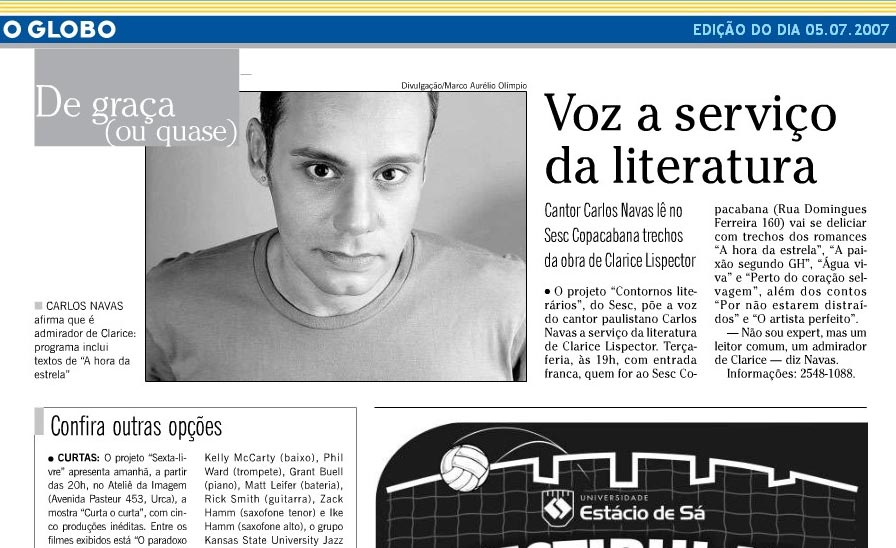 O cantor foi o convidado da terceira edição do Projeto “Contornos Literários (com curadoria de Ricardo Santhiago), que aconteceu em Junho de 2005, no Sesc Carmo, em São Paulo. A série apresentou grandes autores brasileiros através de leituras feitas por intérpretes expressivos. A partir daí, os convites para outros eventos sobre a obra de Clarice Lispector têm sido uma constante. Em Julho de 2007, foi o primeiro artista a participar da edição carioca do evento, promovido pelo Sesc Rio em três Unidades. Projetos lítero musicais não são uma novidade em sua carreira, que prima pela versatilidade. Desde 2000, ele divide o palco com a consagrada atriz Clarisse Abujamra, intercalando poemas e canções. Atualmente, a dupla se debruça sobre a obra do Poetinha Vinícius de Moraes. Em 2007, Carlos estreou “O Feiticeiro das Palavras”, Sarau dedicado ao escritor Guimarães Rosa, também neste formato e apresentado no Rio, São Paulo, Brasília e até mesmo Cordisburgo (MG), cidade natal do grande autor.