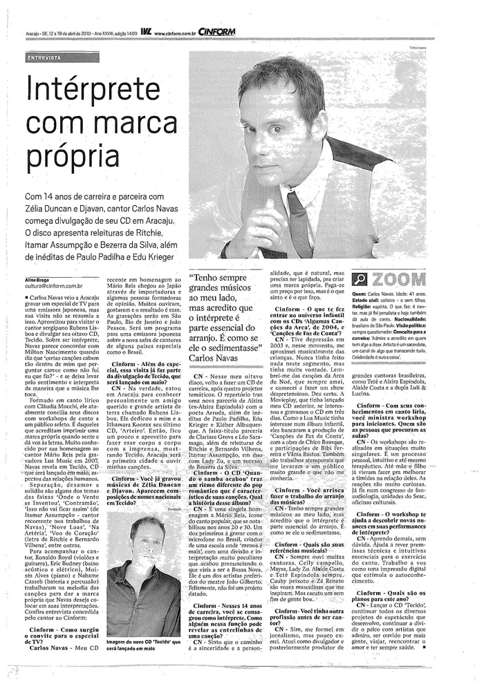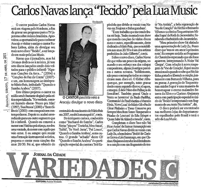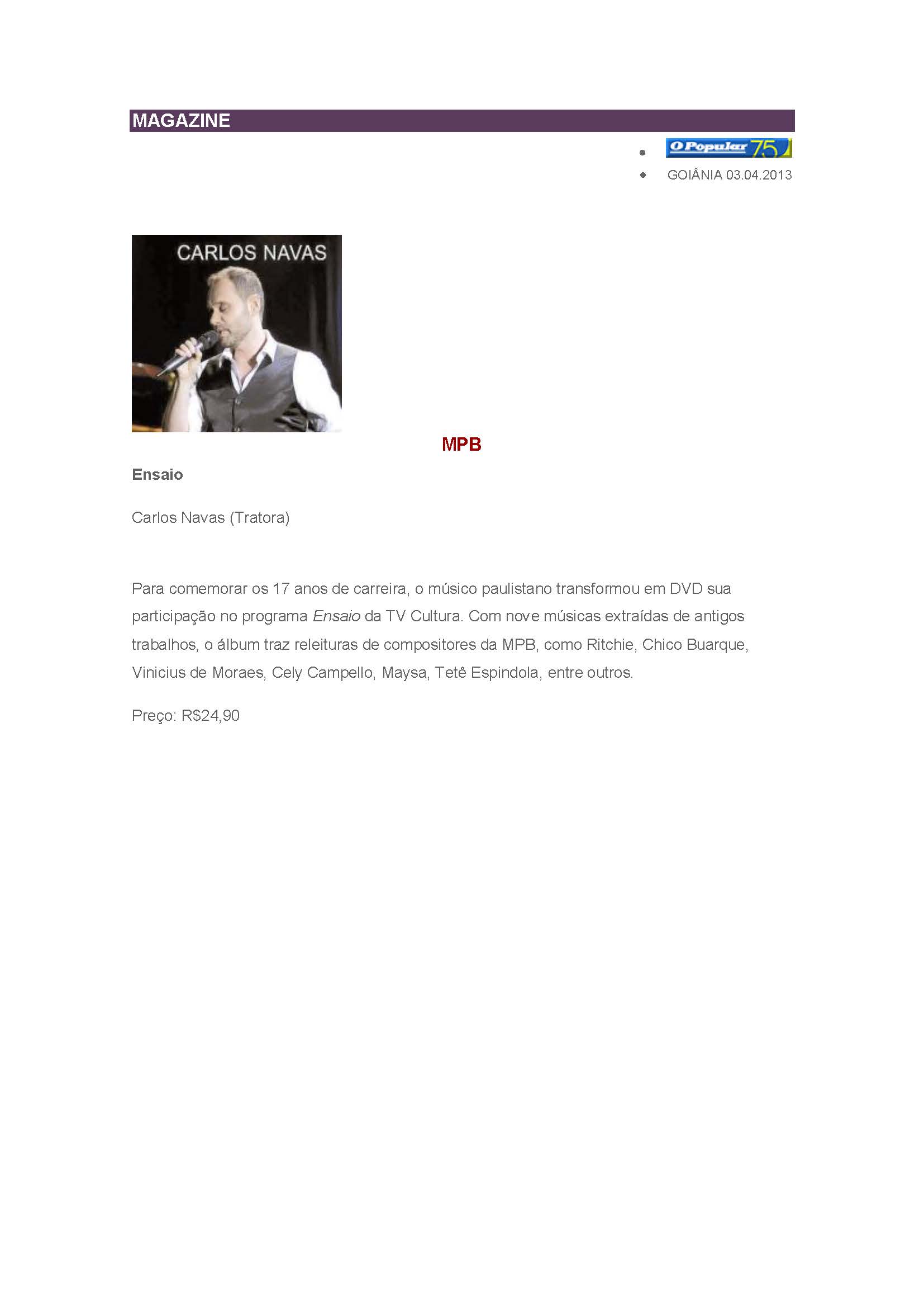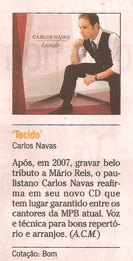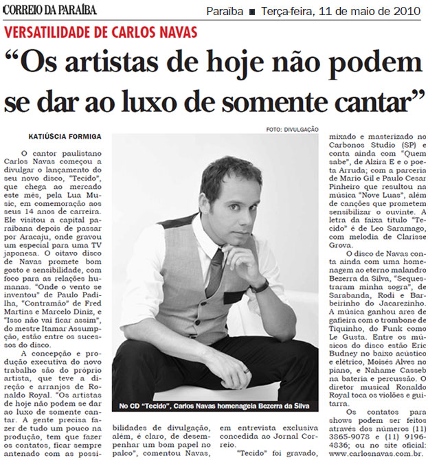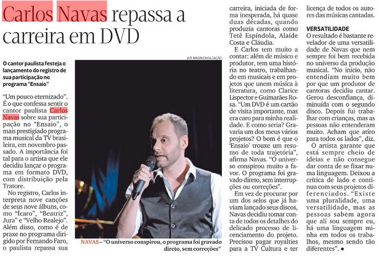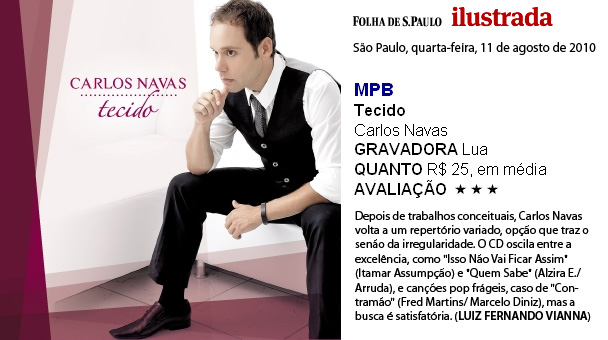 Carlos Navas é um intérprete com 20 anos de estrada, tempo durante o qual lançou dez elogiados álbuns solos e um dvd, que registra sua passagem pelo antológico programa televisivo “Ensaio”, criado e dirigido por Fernando Faro, na TV Cultura. Dono de um timbre singular, com grande extensão, vem trilhando um caminho