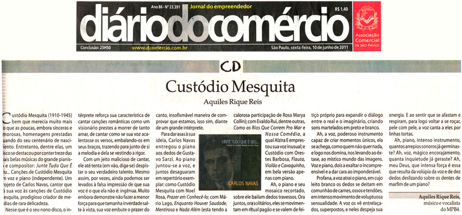 O cantor paulistano tem dez discos solo elogiados, como o infantil "Algumas Canções da Arca...", em que faz releituras das canções que Vinicius de Moraes dedicou às crianças. Em seu repertório, reúne ainda autores contemporâneos expressivos como Alzira Espíndola, Itamar Assumpção, José Miguel Wisnik, Marina Lima e Vitor Ramil. Em seus quinze anos de carreira, vem dividindo o palco com estrelas do porte de Alaíde Costa, Sandra de Sá, Clarisse Abujamra e Tetê Espíndola. Em 2010, lançou o CD "Tecido" e acaba de chegar ao mercado o novo álbum: ”Junte tudo que é Seu...” - Canções de Custódio Mesquita em Voz e Piano.