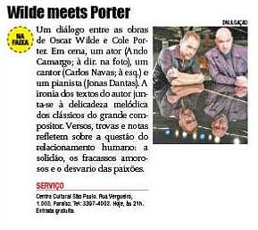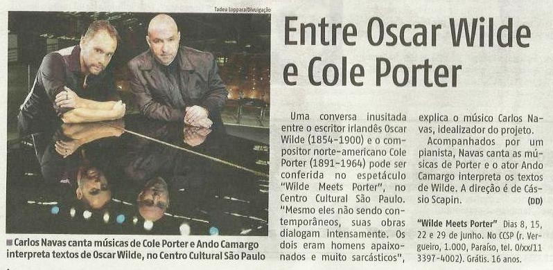 Neste espetáculo refinado, elegante e conciso, o intérprete paulistano Carlos Navas reverencia a obra de Cole Porter acompanhado por piano apresentando uma releitura bastante suave e pessoal de canções mais ou menos conhecidas do lendário autor. Vale frisar que Carlos realizou em 2012 o espetáculo “Wilde Meets Porter”, em duo com ator Ando Camargo, que mesclava textos de Oscar Wilde e canções de Porter, sob direção de Cassio Scapin, com grande sucesso.
