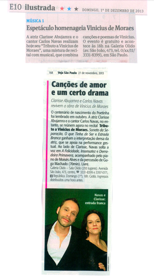 Clarisse Abujamra e Carlos Navas dividem o palco desde 2000, quando estrearam “Por um Triz”. Um encontro de emoção e interpretação delicado, intenso e interativo. Com a química e a sintonia obtidas neste período, dedicam todo um espetáculo à obra de Vinícius de Moraes, numa delicada homenagem. Clarisse recita a palavra, conferindo-lhe densidade atemporal, a surpresa do gesto, a técnica que a consagrou. A voz de Carlos Navas é o veículo ideal para a manifestação da palavra cantada. Juntos em cena, transformam-se no instrumento da canção e do poema. O espetáculo transcende os limites de mero recital. A tônica é a palavra, essência da poesia e da canção de amor.